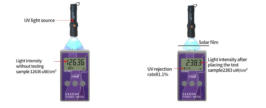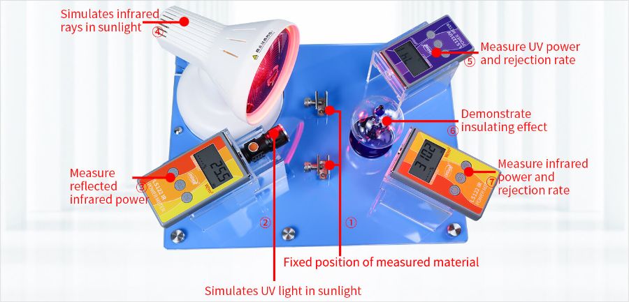 FS3150 güneş filmi satış kiti, pencere filmi ve ısı yalıtım camı gibi ışık ileten malzemelerin ısı yalıtımı, UV koruması ve yansıtıcı ısı yalıtımı etkilerini göstermek için tasarlanmıştır. Cam radyometredeki kanatların dönme hızı ve yüzde verileri aracılığıyla engelleme etkisini doğrudan gösterebilir. Etki sezgiseldir ve anlaşılması kolaydır.