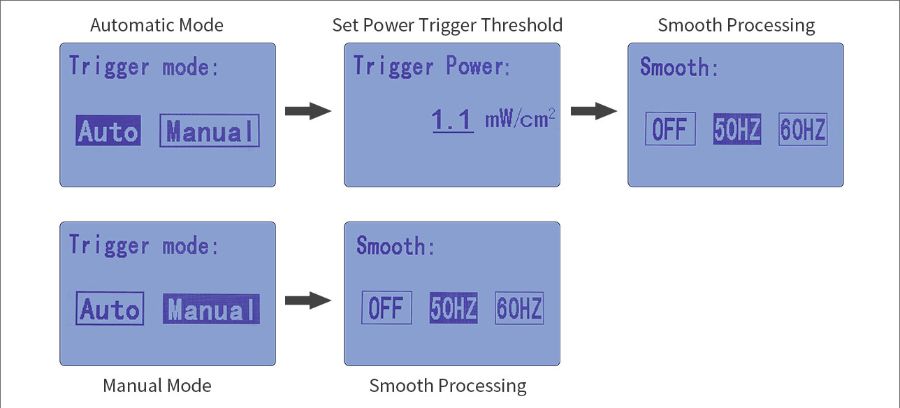 İki ölçüm modu vardır. Biri, ölçümü manuel olarak başlatması veya bitirmesi gereken Manuel moddur. Bir diğeri, ışık kaynağı tarafından yayılan enerji yoğunluğu ayarlanabilen tetikleme eşiğinin üstünde veya altında olduğunda otomatik olarak açılabilen veya ölçümü sonlandırabilen otomatik modlardır.
