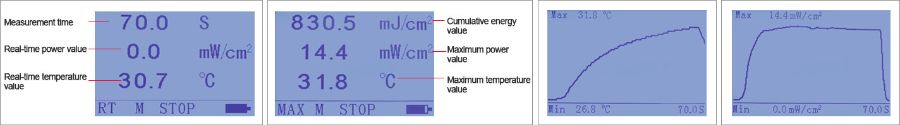 Test ettiğiniz UV ışık kaynağını daha iyi tanımanıza yardımcı olacak dört arayüz vardır: Maksimum değerler arayüzünde kümülatif enerji değeri, maksimum güç değeri ve maksimum sıcaklık değeri elde edebilirsiniz. Ölçüm süresi RT arayüzünde kaydedilebilir. Sıcaklık ve güç eğrisi arayüzünde, ışık kaynağının sıcaklık değişimini ve enerji yoğunluğu değişimini öğrenebilirsiniz. Dört arayüz serbestçe değiştirilebilir