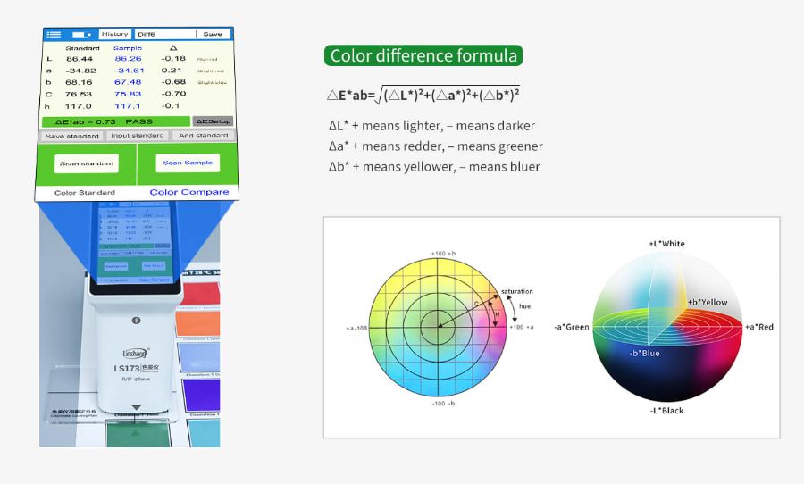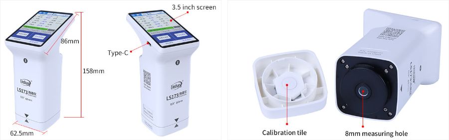 LS173, D/8° (SCI) optik geometri tasarımına sahip, taşınabilir, çok işlevli bir kolorimetredir. Renk analizörü, mükemmel bir çalışma deneyimi sağlayan 3,5 inç IPS renkli kapasitif dokunmatik ekranla donatılmıştır. Kolorimetre, birden fazla doğal renk tablosunu entegre eder ve ölçülen rengi en yakın renk kodlarıyla hızlı bir şekilde eşleştirebilir. Renk farkı ölçer ayrıca bir renk farkı karşılaştırma işlevine sahiptir, çeşitli standart renk ekleme yöntemlerini destekler, renk farkı eşiği ayarlanabilir. Renk farkı formülü, hızlı QC testini gerçekleştirebilen esnek bir şekilde seçilebilir.