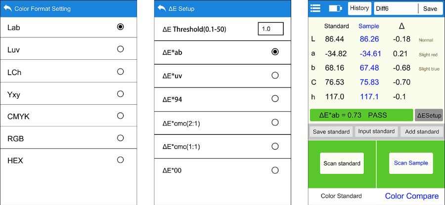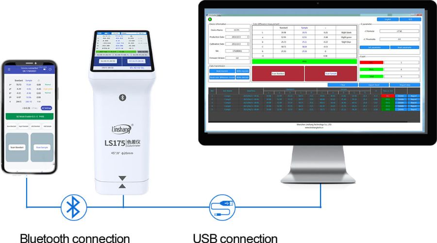 LS175, 20 mm'lik büyük bir ölçüm açıklığına, 3,5 inç IPS renk kapasiteli dokunmatik ekrana sahip, cep telefonu veya PC ile bağlanabilen, elde taşınan bir 45/0 aydınlatma geometrisi kolorimetresidir. Bu cihaz, APP'yi cep telefonuna veya PC yazılımına bağlamadan bağımsız olarak çalışabilir. Çeşitli renk tabloları, taranan rengin en yakın renk numarasını kısa sürede eşleştirmeye yardımcı olur. Cihaz ayrıca, birden fazla standart ekleme yöntemini destekleyen renk karşılaştırma işlevine sahiptir. Renk farkı eşik ayarının mevcudiyeti, QC hızlı denetimini sağlar. Cihaz, renk paylaşımı ve rapor yazdırma gibi işlevlerini genişleterek APP ve PC yazılımını bağlayabilir.